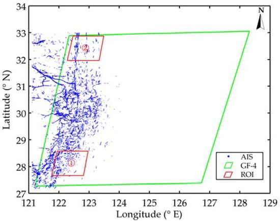 Coverage area of GF-4 satellite image with AIS data. The locations of AIS reports are marked by blue dots. The imaging area is bounded by green lines while two ROIs are bounded by red lines. ROI 1 and ROI 2 are labeled with ① and ②, respectively.
