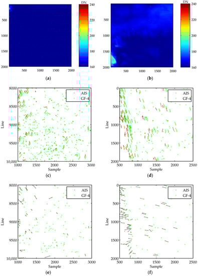 Figure 4 is the results of ship detection and tracking in two ROIs. In ship detection, the larger the threshold of the saliency map is, the smaller the recall is and the larger the precision is. The empirical value of the threshold is 3~5, and it is set to 4 in the experiment. In Figure 4a,b, the units of intensity image are digital numbers (DN). From Figure 4a–d, we can see that the ROI 1 is homogeneous, but a lot of false targets are existed after ship detection. The ROI 2 is an inhomogeneous and traffic-intensive region where there are a lot of ships. In Figure 4c–h, ‘AIS’ and ‘GF-4‘ mean the locations of AIS data and the locations of GF-4 detection reports, respectively. There is absolute positional deviation between the GF-4 detections and the ground truth locations directly using RPCs and the errors are about 10–60 pixels in the sample and line. As shown in Figure 4c,d, we can also see that the points of ship sailing look like curved instead of straight. This is because there is a position deviation between GF-4 satellite sequential images. Therefore, it is necessary to correct the position error before ship tracking. The results of GNN data association in the first frame and matching point pairs after RANSAC processing are shown in Figure 4e–h. The distance threshold in GNN association is set to 200, and the number of iteration in RANSAC processing is set to 1000. From the comparison of the subfigures, we can see that the performance of RANSAC is good and it can remove the erroneous point pairs effectively.