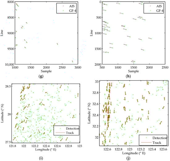 Detection and tracking results in two ROIs. (a,b) Intensity image in ROI 1 and ROI 2, respectively; (c,d) Results of ship detection in image coordinates in five frames; (e,f) GNN data association between AIS and GF-4detection in a single frame; (g,h) Point pairs after RANSAC processing; (i,j) Results of ship tracking in geographic coordinates using improved MHT.