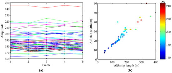 Amplitude information of ships. (a) Amplitudes of tracked ships in five frames. Different colored lines represent different ships; (b) Mean amplitudes of tracked ships compared with the sizes of ships verified by AIS data.