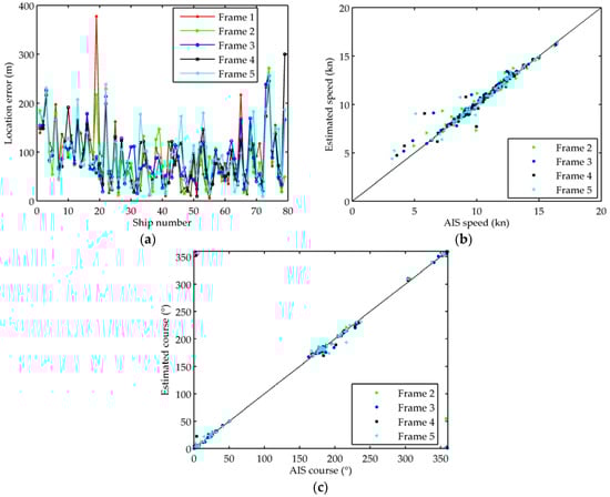 79 ships verified by AIS data in two ROIs are used to assess the motion state. Figure 6 shows the comparisons of motion state estimation between the tracking results and AIS data in five frames. The average absolute error of motion estimation about ships is reported in Table 3 in detail. The tracking accuracy is accurate and improved largely after position correction with AIS data. The total location error is reduced from 3800 m to 90 m. The speed and the course are well estimated by our method, and the average error of speed and course are 0.3 kn (approximately 0.15 m/s) and 2.5°, respectively. Meanwhile, it can also be seen from Figure 6b that the estimated accuracy of speed is improved with the increase of speed. The accuracy of motion estimation can basically meet the needs of marine surveillance, and illustrates the high-efficiency of the proposed method. The results presented in the experiment are obtained with a laptop (Intel Core i5, CPU 2.5 GHz, RAM 6 G) using MATLAB 2010a software. In each ROI, the average processing time from ship detection to ship tracking is approximately 50 s per frame, which shows that our algorithm has the potential for near real-time processing.