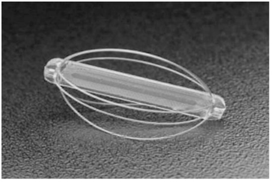 The EndoSure sensor (CardioMEMS, Abbott Laboratories, Atlanta, GA. USA) (Figure 2) is a battery-less pressure sensing implant, which is deployed within the aneurysm sac and it is kept in place using the wire basket that surrounds it [37]. It is a passive IMD since it does not include any electronic components. It is simply an LC tank (inductive-capacitive tank). The inductive component is fixed, while the capacitive component consists of flexible plates whose separation varies with blood pressure [36]. As a result of the change in capacitance the resonant frequency (while transmitting radiofrequency) changes. The shifts in resonant frequency is transduced into real-time pressure measurements.