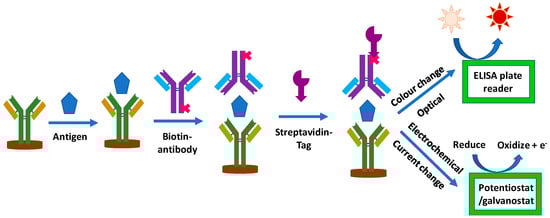 Till date, mainly optical sandwich ELISA-based detection of biomolecules is employed in clinical practice and commonly considered as the gold standard method. These assays use antibodies for specific identification and quantification of the desired antigen/biomarker in a process known as immunoassay; sensors used for these assays are known as immunosensors [,]. In the medical diagnostics industry, traditional optical ELISA is usually carried out in 96 well plates. Suppliers provide kits of reagents and 96 well plates for desired analytes testing and estimation. In such kits, 96 well plates generally come with a primary antibody coated into the wells of the plate via physical adsorption followed by blocking to prevent non-specific binding. The kits also provide operating procedures. In brief, an antigen sample is first incubated with primary antibodies in the well for the required time to make antibody–antigen complex. After incubation, plate is usually washed with wash buffer provided by the kit provider. After washing antigen-antibody complex is incubated with enzyme tagged detection antibody to form antibody-antigen-antibody sandwich. After incubating for the desired time, followed by washing with wash buffer, the complex is incubated with enzyme substrate and indicator dye. During incubation, the enzymatic reaction results in change of color for indicator dye, which on measurement using optical reader provide the absorbance value. Absorbance value on comparison with standard solution calibration provide the analyte concentration. The whole testing procedure is quite lengthy and often requires an expensive optical reader for analyte estimation. However, the use of a sandwich method provides amplified response and thus results in better detection range. In brief, optical ELISA provides highly reproducible, sensitive and specific, quantitative data that makes it an advantageous biotechnological tool in scientific research and clinical diagnosis. However, optical ELISA suffers from tedious/laborious procedures, necessity for centralized laboratory equipment, and a relatively high sample volume is required. Moreover, the detection limit of conventional ELISA is barely less than the nanomolar concentration level, which is inadequate to reach the clinical threshold of many protein biomarkers, especially in the early stage of diseases.