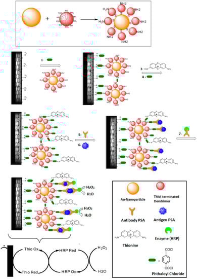 The use of HRP modified hollow AuNPs has been described by Li et al. for the development of an AFP immunosensor. In their method, hollow AuNPs were synthesized by HAuCl4 reduction in N2 environment using sodium borohydride (NaBH4), sodium citrate and CoCl2∙6H2O mixed solution and then modified with l-cysteine modified HRP-NPs. Physically immobilized Thi-anti-AFP based probe then achieved AFP detection down to 8.3 pg/mL when incubated with Ab1-antigen for 30 min at room temperature and the DPV signal was recorded in the presence of H2O2 []. Figure 4 shows the schematic for HRP-HRP-NPs-hollow AuNPs-Thi@anti-AFP bioconjugates development. Moving away from gold, Wang et al. described the use of Fe3O4 and HRP modified mesoporous silica nanoparticles (MSNs) based detection probe for an AFP immunosensor. The detection probe with Ab2 and HRP were immobilized using glutaraldehyde chemistry, and showed AFP detection down to 4 pg/mL when tested via CV in PBS with and without 5 mmol/L H2O2 []. In another study, Wang et al. described silver nanoparticles (AgNPs) based detection probe for CEA estimation. For probe development anti-CEA and glucose oxidase (GOD) were physically immobilized onto Ag nanospheres prepared via an ethylene glycol (EG) and poly(vinyl pyrrolidone) (PVP) assisted method. For immunoassay, probe was incubated with Ab1-antigen for 1 h at 4 °C and the resulting complex was tested via DPV. With such probe they achieved CEA detection down to 0.27 pg/mL []. Further, Zhou et al. utilized HRP tagged BSA-nanosilver microspheres (Ag@BSA) to quantify CEA. Using enzymatic precipitation and amplification of tyramine signal, they achieved CEA detection down to 5.0 pg/mL via DPV method []. Tang et al. utilized HRP and Ab2 modified magnetic nanoparticles (MNPs) based strategy for PSA, PSMA, IL-6, and PF-4 estimation in ab array format. HRP and Ab2 were tagged onto MNP via biotin–streptavidin chemistry. Using HRP tag and added HQ as mediator they detected the target via DPV in the presence of H2O2 and achieved detection down to pg/mL range for all four analytes []. In other study, Uludag et al. utilized HRP and anti-PSA tagged AuNPs as detection probe TMB as mediator to achieve detection down to 0.2 ng/mL when tested via amperometric at −0.1 V in the presence of H2O2 [].