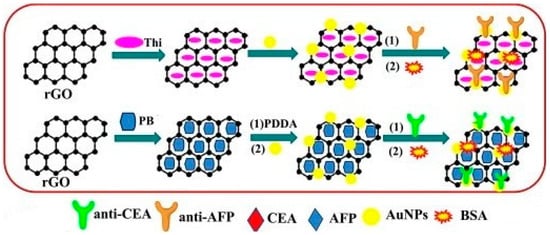 Preparation process of immunosensing probes. In brief, reduced GO was first treated with Thi/Pb for their electrostatic binding, which was then utilized for physical adsorption of pre-synthesized AuNPs onto Thi/rGO or PDDA modified PB/rGO. The bound AuNPs were then utilized for physical adsorption of desired antibodies. Reproduced with permission from [].