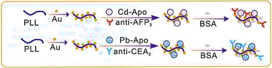 Preparation process of PLL-Au-Cd-Apo-Ab2 and PLL-Au-Pb-Apo-Ab2 signal tags. Reproduced with permission from [].