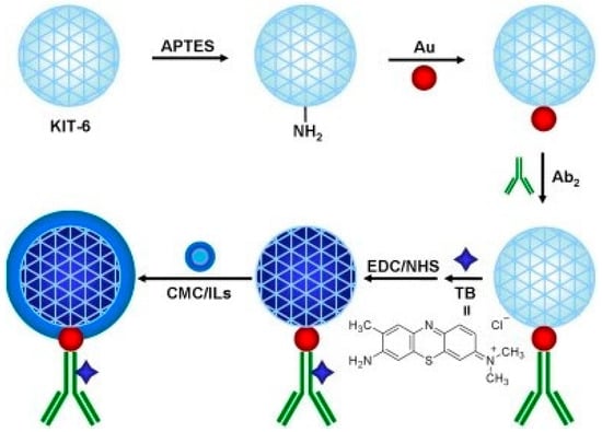 Preparation procedure of the TB/Au@KIT-6/CMC/ILs-Ab2 labels. Reproduced with permission from [].