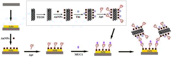 Illustration of the electrochemical sensing strategy for the detection of MUC 1. Inset: Preparation of Apt/Thi-AuNPs/SiO2@MWCNTs. Reproduced with permission from [].