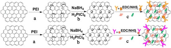 Preparation procedure of PGN-Ab1/2 probes: (a) modification with PEI to obtain active groups of amino; (b) reducing H2PtCl6 to form PtNPs; (c) labeling PGN with thionine-anti-CEA, ferrocene-anti-AFP, HRP and GOD. Reproduced with permission from [].