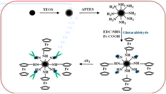 For detection probe, Fe3O4 particles prepared by a solvothermal method were first treated with TEOS to obtain Fe3O4@SiO2 particles, which were then again treated with APTES to get Fe3O4@SiO2–NH2. For Fc-COOH and GA binding on prepared particles, Fc-COOH was first activated using EDC/NHS and then incubated with Fe3O4@SiO2–NH2 and GA overnight with stirring. Fe3O4@SiO2/Fc/GA precipitates thus obtained were utilized for Ab2 binding by incubation at 4 °C for 2 h. During immunoassay, Fe3O4 of captured probe provide catalytic activity towards H2O2, which in turn reduce Fc molecules and provide the detection signal. With such approach, they were able to detect CEA down to 0.0002 ng/mL. Figure 11 illustrates preparation of Fe3O4@SiO2–Fc–Ab2/HRP bioconjugate [].