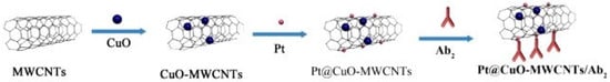 The preparation procedures of Pt@CuO-MWCNTs/Ab2. Reproduced with permission from [].