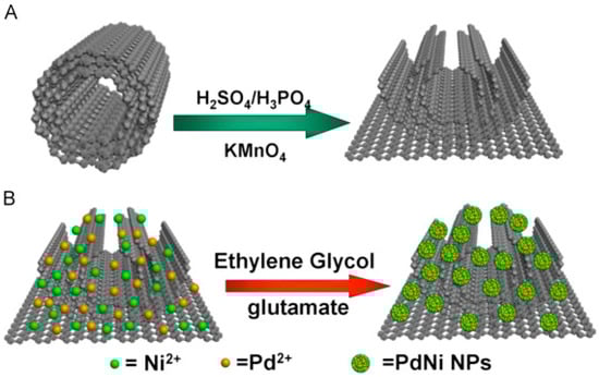 (A) The synthetic process of N-GNRs from N-MWCNTs; (B) The synthetic process of PdNi/N-GNRs. Reproduced with permission from [].