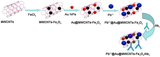 The preparation procedure of Pb2+@Au@MWCNTs-Fe3O4/Ab2. Reproduced with permission from [].