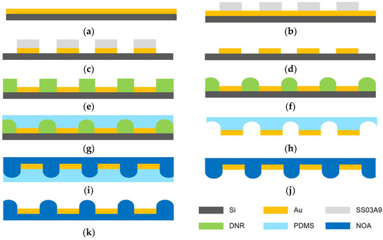 The specific steps of the PLISL process are as follows: A silicon wafer was cleaned in a mixture of H2SO4:H2O2 (3:1) for 30 min at 60 degrees Celsius. After that, a 120-nm thick gold layer [20], which would serve as the light interference screening layer, was deposited on the cleaned wafer by an E-gun evaporator (ZZS550-2/D, Maestech Co., Ltd., Pyungtaek, Korea) without any adhesion layer like titanium or chrome (Figure 2a). A positive photoresist, SS-03A9 (Dongwoo Fine-chem Co., Ltd., Gyeonggi-do, Korea), was patterned on the gold evaporated silicon wafer (Figure 2b). The photoresist patterned wafer was etched by gold etchant, which was a mixture of I2:KI:H2O (1:4:10) (Figure 2c). After removing the photoresist on the wafer with acetone, the gold-patterned wafer was coated by negative photoresist, DNR (Dongjin Semichem Co., Ltd., Incheon, Korea), about 10 μm by a spin coater and baked on a hot plate at 95 degrees Celsius. The second photoresist layer was coated on the first photoresist layer and baked on the hot plate at 110 degrees Celsius. The wafer was exposed using the identical mask with the gold-layer patterning mask to pattern on the gold-free area (Figure 2e). After the UV exposed wafer was developed, the developed wafer was baked on a hot plate to melt the photoresist pattern for the spherical structure by the surface tension (Figure 2f). This heating step is widely known as the thermal reflow process.