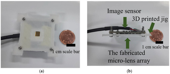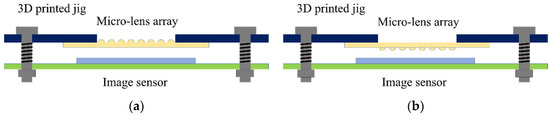 Figure 6 shows the assembled imaging system with the microlens array adjusted by the 3D printed jig, springs, and bolts. Due to the springs and the bolts, the distance between the microlens array and the CCD sensor was calibrated to focus every microlens’ image. The light-entering window of the 3D printed jig is a square shape of 4 × 4 mm. Eighteen microlenses receive light from the light-entering window. The photo sensing part of the CCD sensor is a rectangular shape that is 5.37 × 4.04 mm and 1920 × 1080 pixels.