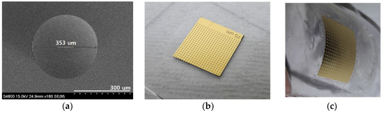 A cylindrical photoresist structure with a height of 10 μm and a diameter of 350 μm was thermal-reflowed. The microlens mold with a curvature of 778.9 μm (rsph was 175 μm and hsph was 19.91 μm) was fabricated, as shown in Figure 4a. The focal length of the microlens implemented using this thermal-reflowed mold was 1.442 mm. Spacing among every microlens was fabricated as 500 μm.