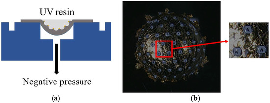 One of the advantages of our PLISL process is that three-dimensional microstructure and integrated layer is transferred not only on a planar substrate but also on a hemispherical substrate using the widely known negative pressure technique (Figure 5a). Due to the negative pressure, the flexible PDMS mold is deformed as the hemispherical structure. Figure 5b shows a microlens array on the hemispherical substrate using a three-dimensionally printed chamber.