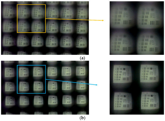 Figure 7 presents images of a printed USAF 1951 pattern captured by two different setups: the microlens-facing-outside setup (Figure 7a) and the microlens-facing-inside setup (Figure 7b). The facing-inside setup shows better contrast around the rim than the looking-outside setup. We could assume that the apertures of the facing-inside setup play a better role because the gold screening layer of the facing-inside setup is closer to the image sensor by a thickness of the NOA substrate.