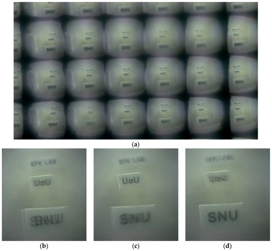 Every subimage represents different perspective views of the identical object. Due to this plentiful information, post-image processing of the multiaperture imaging system generates diverse images including higher-resolution images [21] and multifocusing images [22]. Figure 9 shows multifocusing images. Using the 18 subimages of one single shot (Figure 9a), three differently focused images were reconstructed, as shown in Figure 9b–d. The characters “SNU”, “UoU”, and “EFE LAB” are apart 1 cm, 2 cm, and 3 cm from the imaging system, respectively.
