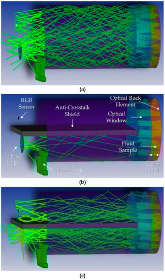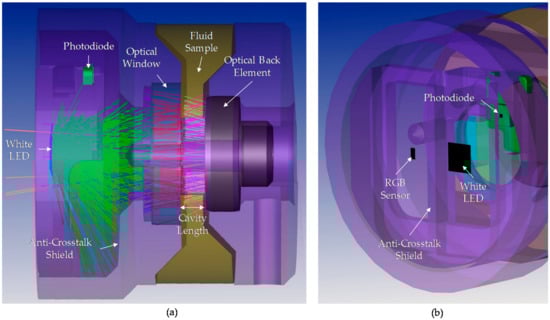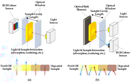 - Although both transmittance and reflectance approaches (see Figure 4) are conducted in the visible spectrum and the light that is not absorbed by the oil is collected by the detector, the light and fluid interaction process differ. This difference makes it impossible to determine at the beginning of the development the RGB absorbance measurement dynamic range that can be achieved with the proposed optical configuration. The RGB dynamic range is the key element of the development since it is directly related to the sensor’s oil degradation measurement resolution and the compatibility with different oil types that could be measured.