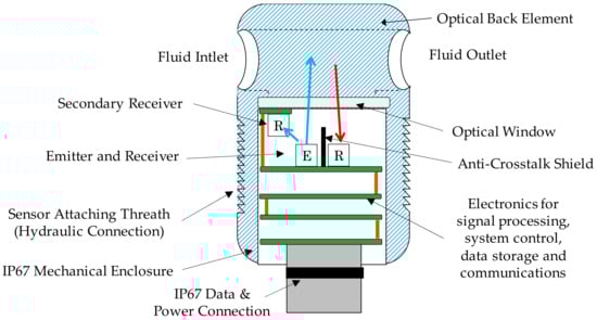 - Fluidical-Mechanical subsystem redesign allows the sensor to operate directly immersed in the fluid, avoiding the necessity of a hydraulic conditioning subsystem required for a hydraulic bypass connection.
