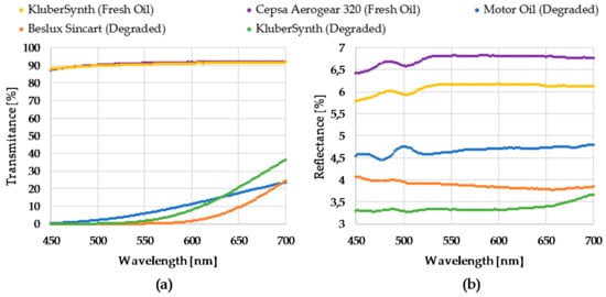 - The light absorption at the oil sample will depend on its absorptivity (ε) and on the sample cavity length (L). Additionally, the total diffuse reflectance is also a parameter dependent on the chemical properties of the sample and on the sample length. Graphs displayed in Figure 11 show the transmittance and reflectance visible-NIR spectral values for different oil samples (see Figure 12) at different degradation status, measured with a laboratory equipment (LAMBDA 850 UV/Vis Spectrophotometer, Perkin Elmer, Waltham, MA, USA) using a 1 mm cuvette for the oil sample. According to these graphs and applying the Absorbance to Transmittance conversion displayed in equation (1), the absorbance of each sample can be obtained for the central wavelengths of the RGB colour sensor (see Table 5).