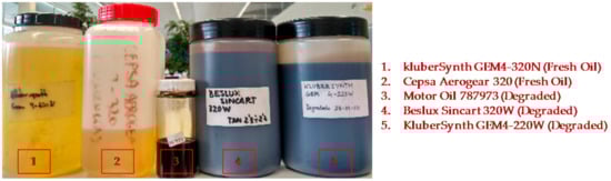 - Zeng, Q.; Dong, G.; Yang, Y.; Wu, T. Performance Deterioration Analysis of the Used Gear Oil. Adv. Chem. Eng. Sci. 2016, 6, 67–75. [Google Scholar] [CrossRef]