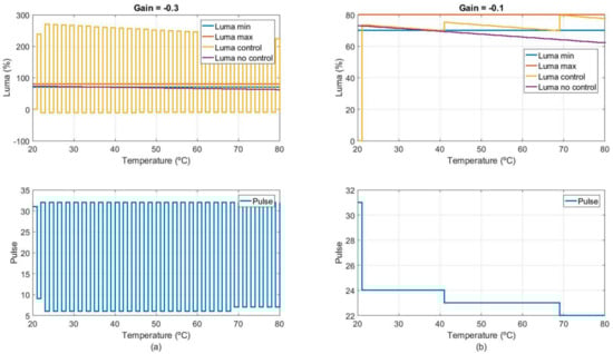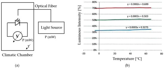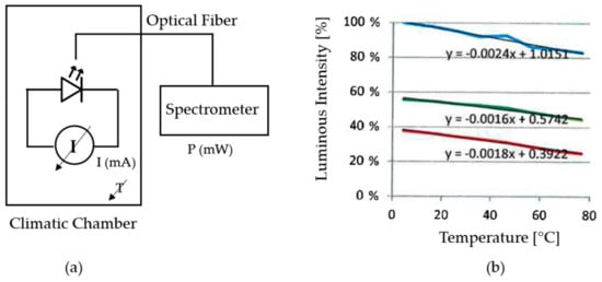 - The dependency between the white LED and the temperature is tested making several measures with the LED in a climatic chamber over a temperature range of 0 °C to 80 °C. To measure the luminous intensity emitted by the LED, it is connected with an optical fiber to a VIS-NIR spectrophotometer (HR-2000+, Ocean Optics, Dunedin, FL, USA) placed outside the climatic chamber (see Figure 20a). Figure 20b shows measured luminous intensity at the wavelengths of the blue, green and red colours. A variation of approximately 20%, 13% and 15% is observed at wavelengths of the colour blue, green and red, respectively, over the tested temperature range.