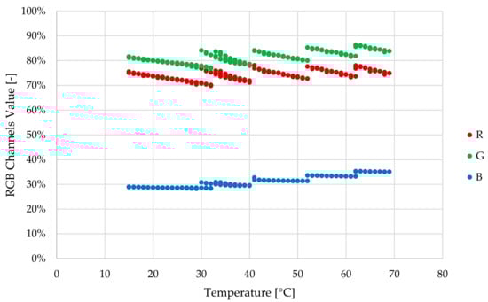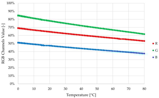 - The dependency between the RGB colour sensor and the temperature is also tested making several measures with the RGB sensor in a climatic chamber over a temperature range of 0 °C to 80 °C. The RGB photodetector is illuminated with a 12 W broadband tungsten-halogen light source (HL-2000, Ocean Optics, Dunedin, FL, USA) placed outside the climatic chamber and connected to the colour sensor with an optical fiber (see Figure 21a). Figure 21 shows the measured luminous intensity at blue, green and red wavelengths. The variation of RGB measurement over the tested temperature range is negligible compared to the results obtained with the white LED.