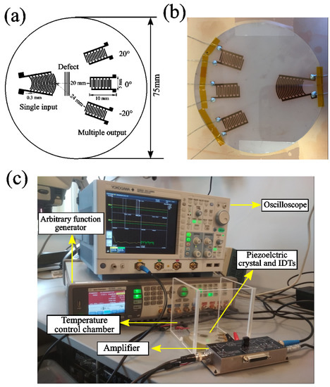 SIMO IDTs were fabricated on the LiNbO3 single crystal (Figure 2). The Lamb waves were excited using a curved single-input IDT, and detected signals were received using multiple receivers that were fabricated as a SAW sensor on the LiNbO3 crystal. The interspacing distance between two electrodes and the width of the electrode were kept constant.