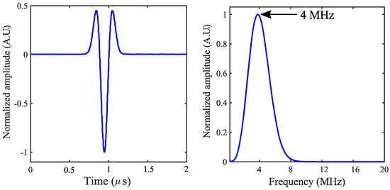 Dimensions of the surface flaws are 25 × 3 × 0.75 mm3 for the first surface flaws. For the second damage state/flaws, a similar dimension of silver paint was spin-coated on the exactly opposite side of the first flaws. In order to observe the effect of the further defect, a third damage state with a similar dimension has been implemented just beside the first flaws. After inserting every damage state, data were recorded for all the IDT sensors. The received signals from the reference state were compared with that of the damaged state. An arbitrary signal generator (Agilent 81150A, Studio City, California, USA) was used to excite the electrodes with a broad-banded pulse (second derivative of a Gaussian). The signal used for excitation and its frequency content are shown in Figure 3. All the experiments were performed in a thermally insulated chamber to avoid the temperature fluctuation during the experiments.
