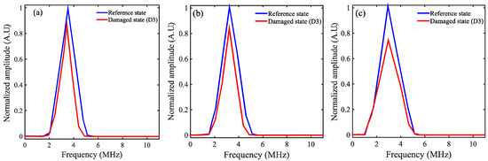 Frequency content of the windowed signal for reference and a damage case corresponding to IDT sensors mounted at (a) 0° orientation; (b) 20° orientation and (c) −20° orientation.