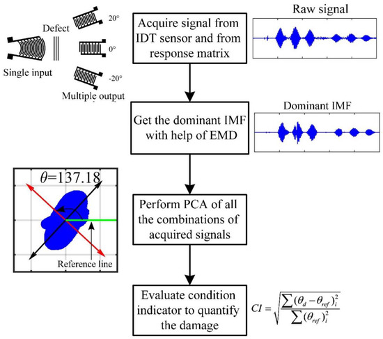 The raw data acquired by the IDT sensors behaves as a cryptic signal which does not provide direct measure of damage. Hence, it is extremely important to extract and evaluate sensitive features from the signals for quantification of damage. The selection of appropriate and sensitive features is determined by the material under investigation, and the magnitude and type of damage. The commonly used features are change in the resonating frequency, change in the peak amplitude, reduction in the energy content of the signal, and change in the modal parameters such as mode shape and the eigenfrequencies of the signals. The statistical damage-sensitive features in terms of statistical distance measures are: Mahalanobis distance [62], Mahalanobis distance between phase space topology, and change in phase space topology [63]. The time-series analysis methods such as Auto-Regressive and Auto-Regressive with eXogeneous input models are popular methodologies for damage detection. The time-series methods require data from healthy structures only during the training phase, and this is the main advantage of these methods. The efficient system identification (SI) techniques utilize features derived from wavelet transform, Hilbert–Huang transform, empirical mode decomposition (EMD), principal component analysis (PCA) and so on. SI is challenging in a noisy environment and also for systems possessing low energy. SI techniques work on the assumption that the effect of damage on any system is linear, which is not the actual case. The above-mentioned techniques are mostly adopted on vibration data of the structure to monitor its health. Here, we apply these techniques on ultrasonic wave propagation data to monitor health of a piezoelectric crystal. The algorithm proposed in the current work is a combination of EMD and PCA. The process of EMD gives the dominant intrinsic mode function that has no noise and redundant information. This step helps to avoid false alarm, as any redundant information, if present, will alter the eigenstructure of the signal even in the case of no damage. Later, with the help of PCA, the change in the eigenstructure is evaluated and a sensitive condition indicator is proposed. The condition indicator successfully identifies and quantifies the damage present.