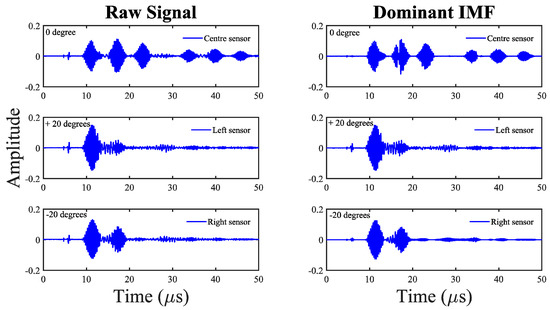 In the present case, as the total number of IDT sensors receiving signal is three, the total number of combinations for two-dimensional PCA is three, as explained in Section 4.3. The three IDT sensors shown in Figure 1 are represented as left (20°), right (–20°) and centre (0°) sensors. Therefore, the possible three combinations for PCA are combination one: left and centre, combination two: right and centre, and combination three: right and left.