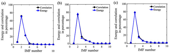 The energy and correlation of IMFs calculated using the above procedure are normalized with respect to the maximum value and then represented in percentage, as shown in Figure 10. The most strongly contributing IMFs according to the above two criteria are the ones that possess a maximum percentage of energy and correlation. The dominant IMFs are considered instead of the original response signal for further analysis. This step allows de-noising of the signal and facilitates removal of ambient disturbances.