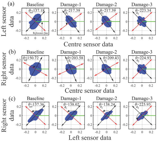 The PCs obtained using PCA are an important indicator of the underlying eigenstructure of the data. In our case, we monitor the changes in the eigenstructure of the matrix XIMF corresponding to the reference and damaged states. This step is pursued on the reasoning that a change in the state of the piezoelectric crystal will distort the eigenstructure of the response signal. The distortion in the eigenstructure of the data is quantified based on the changes in the angle of the PCs obtained from PCA. Let and be the angles of PCs with respect to the reference axis corresponding to the healthy and three damaged states, respectively (Figure 11).