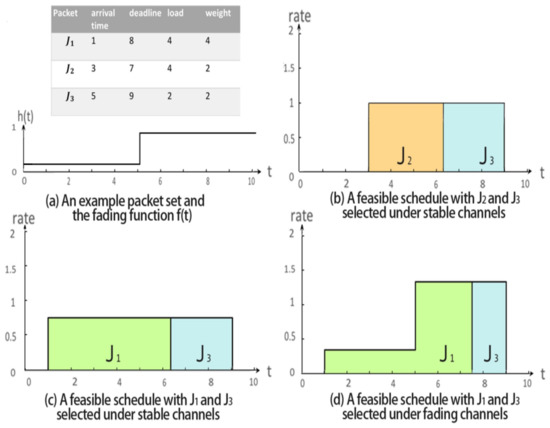An example with three packets. The table in (a) shows the detailed information of the three packets and the step function in (a) shows the fading factors over time. (b–d) are possible rate scheduling policies under static and fading channels.