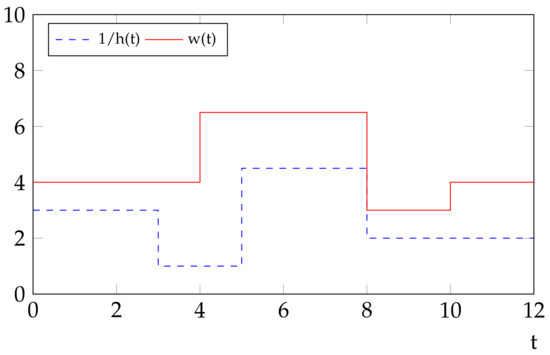 Now we have a fierce relationship between W and . Note that although has not shown up in the right side of Equation (12). They play a vital role since they provide a certain period which determines the values in that period. By enumerating , and , we could figure out the shape of the last block in the optimal schedule.