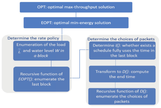 In Section 3, we will design a pseudo-polynomial time algorithm, named DLDP, to compute the optimal solution, which is the best possible as the problem will be proved to be NP-hard. The high level idea of the design is as follows. First, instead of computing the maximum achievable throughput under an energy budget (denoted as ) directly, we focus on a reversed version of the problem, i.e., computing the minimum energy (denoted as ) needed to achieve a given total value. Then, we will develop a dynamical programming algorithm to compute the optimal solution of . Knowing that how much energy should be spent to achieve a value, we can enumerate the possible values and find how much value can be achieved given an energy budget. Figure 3 is a flowchart showing the idea of our design.