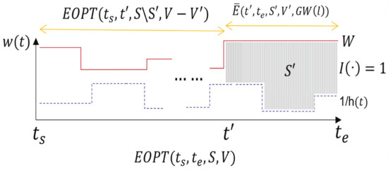 Figure 4 demonstrates an example showing the recursive function of . Given a general interval , suppose that the optimal solution keeps at a steady water level W in the last block, say . Assume that the total value achieved therein is and the corresponding transmitted packets are chosen from a set . Then, the energy consumption in would be if the time in that period is fully used to transmit a subset of packets from set . Thus, as a trick, we use a binary function (to be determined later) to identify whether there exists a feasible schedule that keeps at a water level W in and transmits a subset of packets from with the total value achieved by fully occupying the time in that period. Accordingly, the energy consumption in the remaining sub-interval can be returned recursively by function , which transmits packets from the remaining set while achieving a total value . Thus, the total energy consumption in could be returned by combining these two parts. Therefore, if , then the total energy consumption in equals to that of plus . Otherwise, the value is set with when . To simplify the presentation, we use to return value if and value ∞ otherwise. That is,