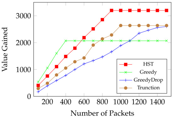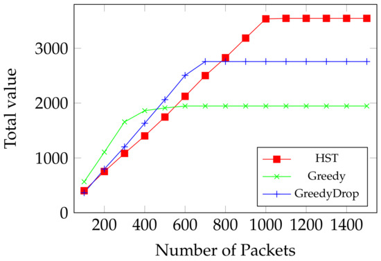 We first evaluate the performance of HST when the number of packets increases. As shown in Figure 10, although the total value gain by HST is reduced when running over non-FIFO tasks, HST still outperforms other algorithms as more packets arrive. Moreover, while other algorithms goes to the ceiling, the total value gained by HST is much higher than that gained by others.