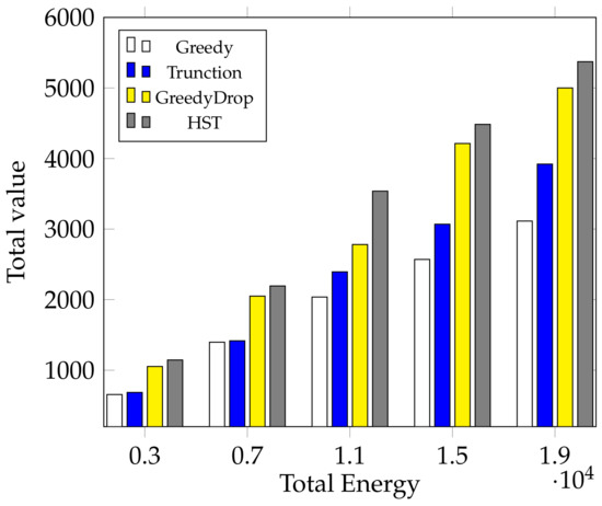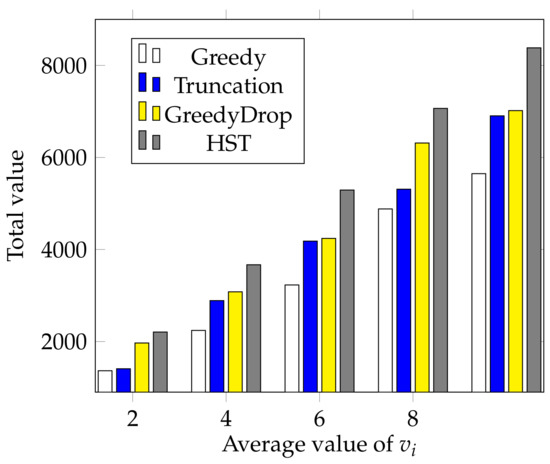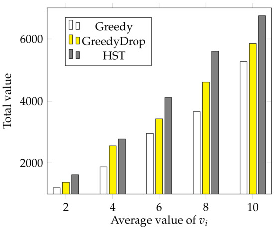 Besides, we conduct a simulation to examine the influence of the average value of . As we can see from Figure 13, the total value gained by different algorithms increases almost linearly as the average value of increases. At the same time, HST still outperforms other algorithms extensively when the average value of varies.