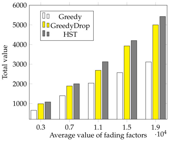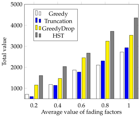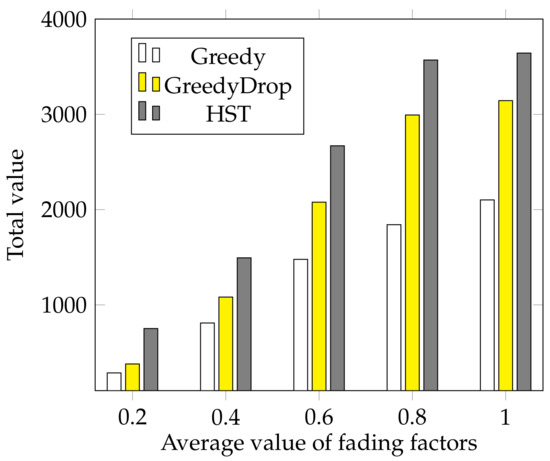We further evaluate the performance of HST when the fading factor changes. In this simulation, the fading factors are generated according to a normal distribution where a varies from to 1 with a step of 0.2. We can see from Figure 7 that the total values gained by HST and other algorithms increase as the average fading factor a increases. Besides, the total value gained by HST is much higher than that of other algorithms, which validates the efficiency and the robustness of HST again.