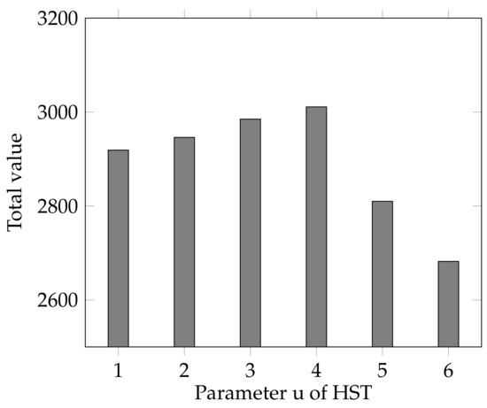 As parameter u is also an important index of HST, we also examine its influence on the results by varying it in range . As shown in Figure 9, the highest total value is achieved at . When u is too small, e.g., , each decision is made too early to collect enough information. When u is too high, e.g., 5 or 6, the “hesitation” time is too long, which makes the decision too late to respond to the requests early. In practice, the selection of value u should be tested and we suggest set an intermediate value that is not too large.