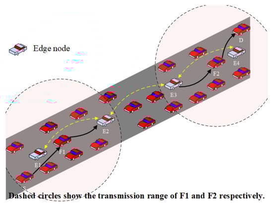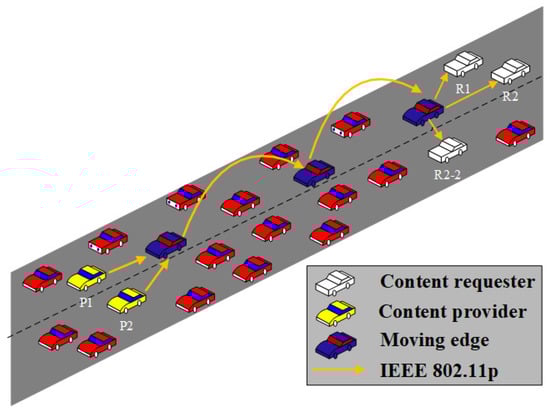 Here, vehicles are used as edge nodes which conduct packet forwarding, computing, and content caching. We propose a concept that uses the same forwarder nodes for different traffic flows. As shown in Figure 1, three different traffic flows, specifically “P1→R1”, “P2→R2”, and “P2→R2-2”, use the same edges nodes for packet forwarding. The use of the same forwarder nodes results in two main benefits. First, the efficiency of wireless resource utilization is improved because the number of sender nodes can be reduced. Second, content caching at edge nodes becomes easier, resulting in a higher performance.