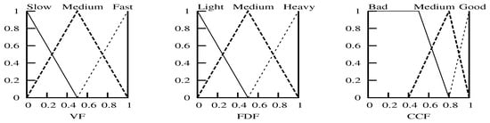 Figure 2 shows the fuzzy membership functions for the velocity factor, follower density factor and channel condition factor. The velocity membership function defines what degree the velocity factor belongs to {Slow, Medium, Fast}. Similarly, the follower density membership function defines what degree belongs to {Heavy, Medium, Light} and what degree the channel condition factor belongs to {Good, Medium, Bad}.