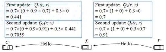 where denotes the one-hop neighbor set of node r. When node c is a neighbor of node r, the reward is 1 and otherwise 0. Please note that only one Q-value is maintained for each pair of state and action. Upon reception of a hello message, the corresponding Q-value is updated according to Equation (6) which discounts the reward with the increase of number of hops. This ensure that the hop count is considered in the route selection. The quality of each link is also taken into account by discounting the reward with the link status value []. As a result, a Q-value represents the evaluation of a next packet forwarder candidate with the consideration of multi-hop performance. Therefore, the proposed scheme is able to optimize the route to the reference node. Figure 5 shows an example for Q-value update where is 1.