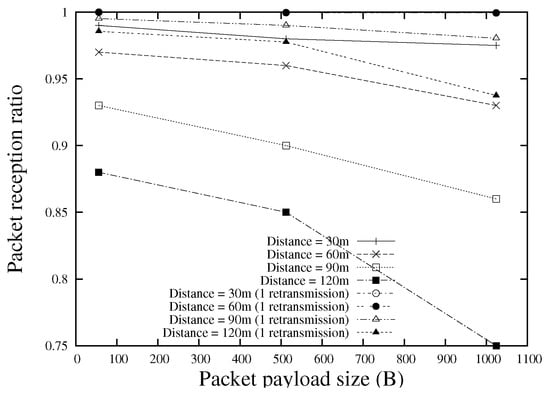MAC broadcast frame reception ratio for various packet payload sizes.