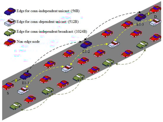 There have been many studies discussing the routing problem in VANETs [5,6,7,8,9,10,11,12,13,14,15,16,17,18,19,20]. However, the unicast routing problem and broadcast problem have been discussed separately. Different applications could possibly require different levels of quality of services (QoS). Therefore, it is particularly important to consider context information, such as communication type (unicast or broadcast), end-to-end connection-dependency, and packet payload size, in the route selection. In the unicast communications, frame retransmissions can be conducted at the MAC layer while this is impossible for broadcast communications. As a result, the edge node selection criteria for unicast and broadcast communications are totally different. If an application only cares about the throughput, a delay tolerant approach could be a solution [21]. The packet payload size is another important context information that should be considered for the route selection. A larger packet will face a higher packet loss probability. The performance of a communication system can be improved by taking into account the context information for the routing decision. However, the design of an edge-based approach that is capable of handling different types of applications with different context information is still an under-explored research issue.