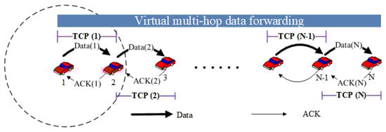 The main purpose of sensor data collection applications is to send the data to the cloud. Therefore, in most cases, a real-time end-to-end feedback is not required. To solve the performance degradation problem of TCP in multi-hop networks, we use a multi-hop data delivery virtualization approach [24] to conduct multi-hop data transmissions through multiple one-hop TCP sessions. The virtualization approach works on the top of transport layer. As shown in Figure 8, a multi-hop data transmission from vehicle 1 to vehicle N is conducted by multiple one-hop data transmissions where each hop is managed by a TCP session, which ensures the reliability and fairness while facilitating an efficient use of wireless resources. Each forwarder node is responsible for transmitting data segments to the next hop which is closer to the destination. Since each one-hop communication is conducted based on TCP, the congestion window size at each TCP sender node is not affected by the number of hops between the source node and the destination node.